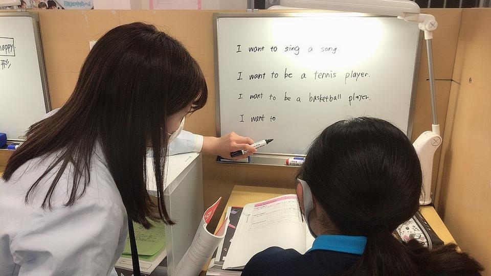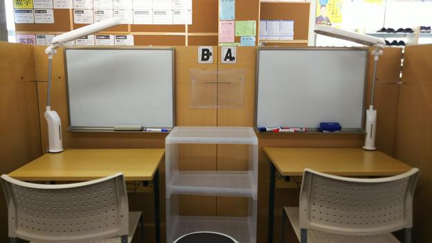 ナビ個別指導学院の授業は、個別の席ごとに設置された自分専用のホワイトボードで解き方や考え方を一緒に確認、それから生徒が問題を解くという「個別授業」スタイルです。