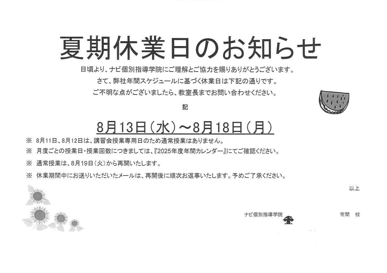 上記期間は教室がお休みとなっております。
