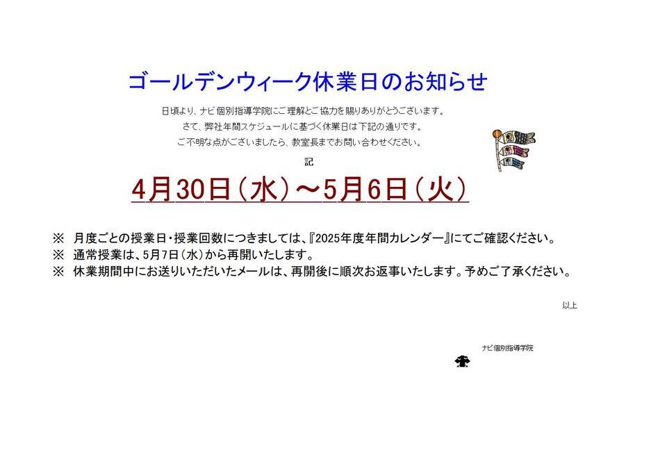 ゴールデンウィーク休業期間となっております。