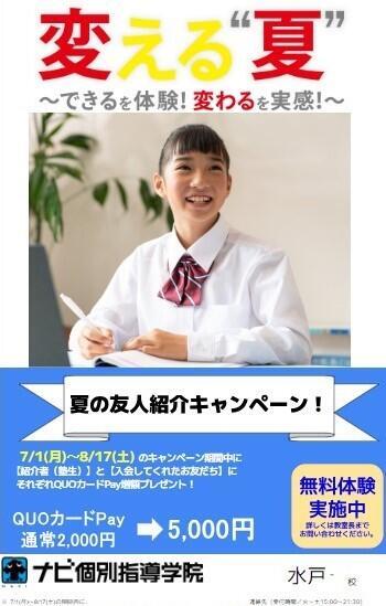 なんと7/1~8/17の期間に既に塾に通っているご友人から紹介されて入会した方には5000円分!