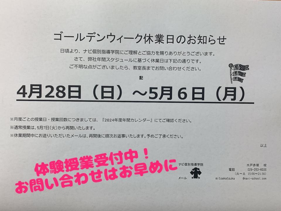 水戸市・城里町の個別指導塾:ゴールデンウィーク休業のお知らせ