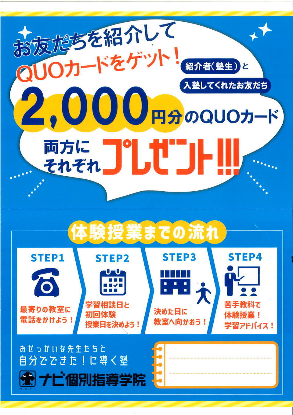 ナビ個別に在籍の生徒から紹介を受けて入塾するとなんと紹介した人もされた人も2000円のQUOカードPayがもらえます!