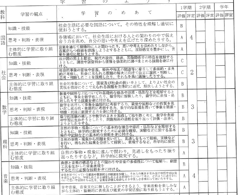 成績表の評価項目は「知識・技能」「思考・判断・表現」「主体的に学習に取り組む態度」の3つですね。