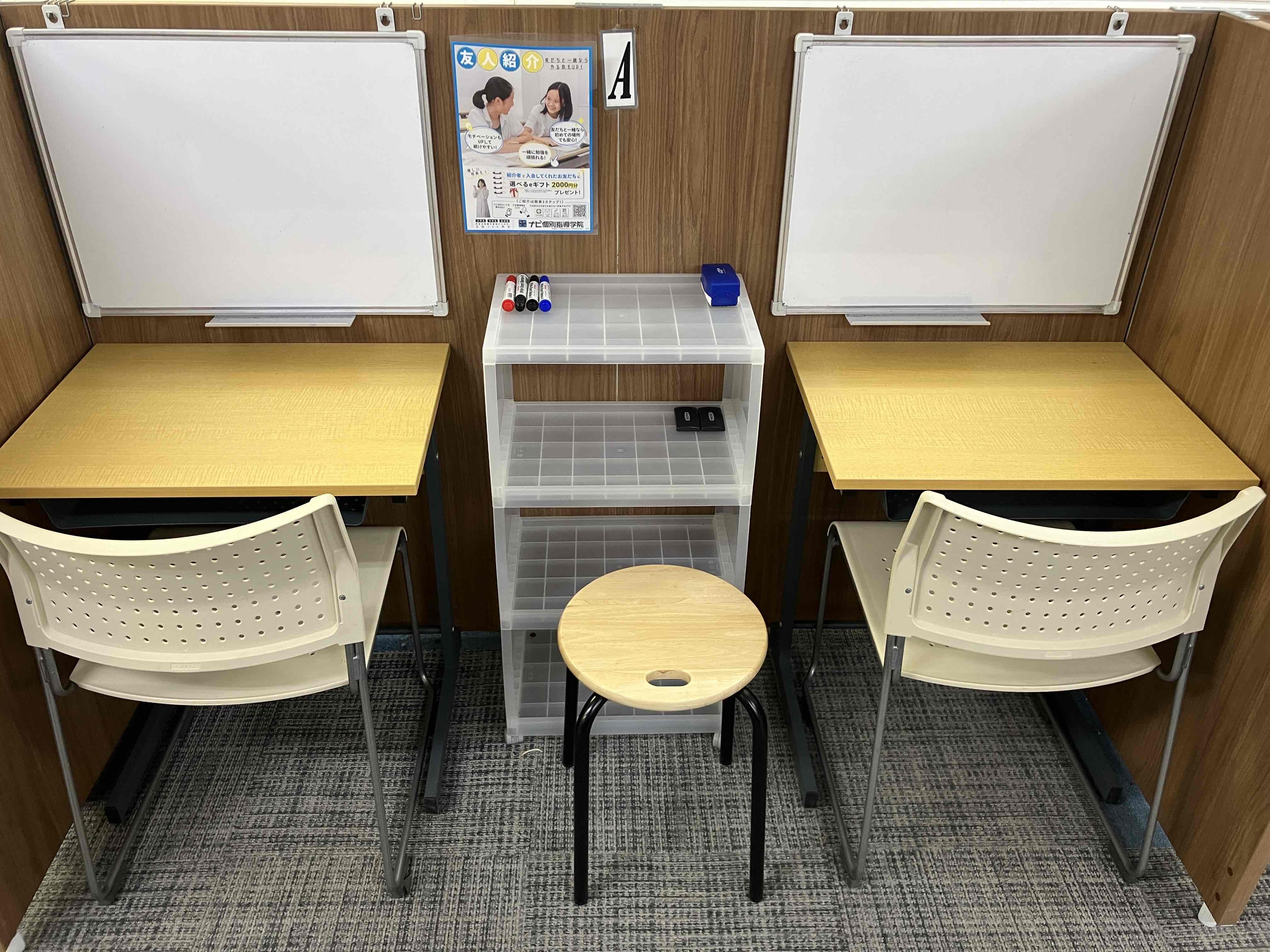 ナビ個別指導学院の授業は、個別の席ごとに設置された自分専用のホワイトボードで解き方や考え方を一緒に確認、それから生徒が問題を解くという「個別授業」スタイルです。