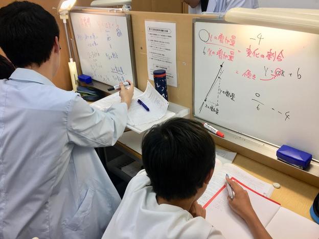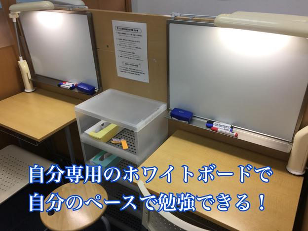 ナビ個別指導学院の授業は、個別の席ごとに設置された自分専用のホワイトボードで解き方や考え方を一緒に確認、それから生徒が問題を解くという「個別授業」スタイルです。
