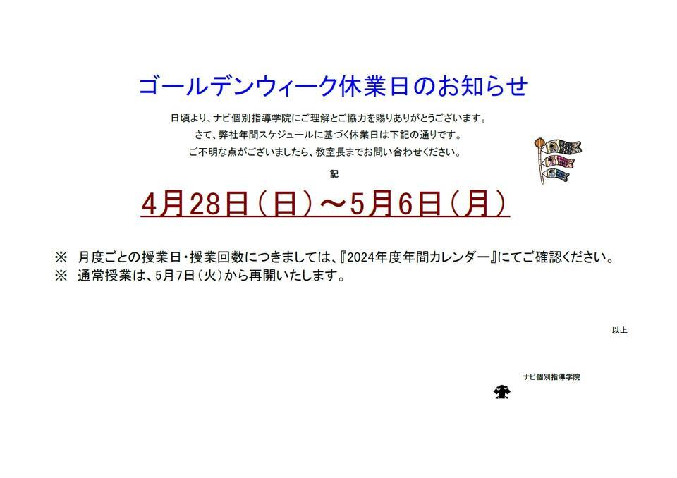 4/28(日) ~ 5月6日(月)※月度ごとの授業日・授業回数につきましては、「2024年度年間カレンダー」にてご確認ください。※通常授業は5月7日(火)から再開いたします。