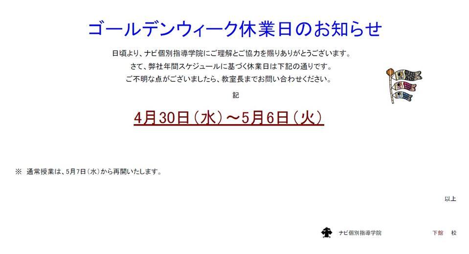 来週から下記期間、GW休業のため通常授業がお休みとなります。