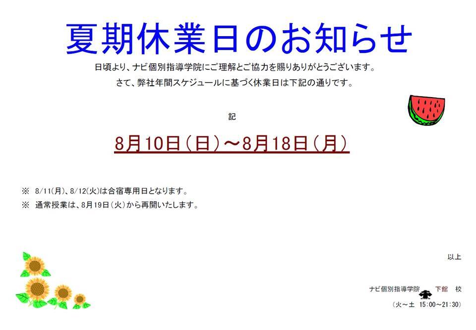 来週から下記期間、夏季休業のため通常授業がお休みとなります。