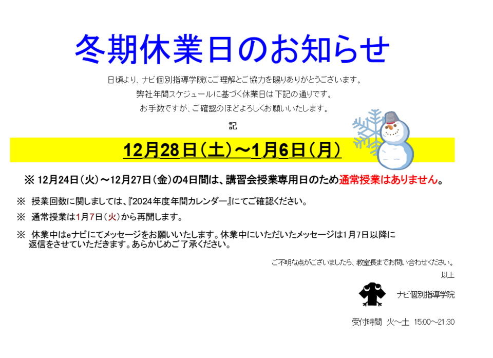 日頃より、ナビ個別指導学院にご理解とご協力を賜りありがとうございます。