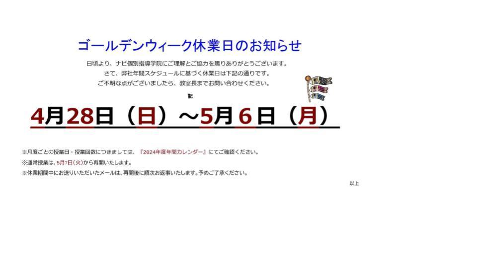 東海村の個別指導塾:ゴールデンウィーク休業日のお知らせ