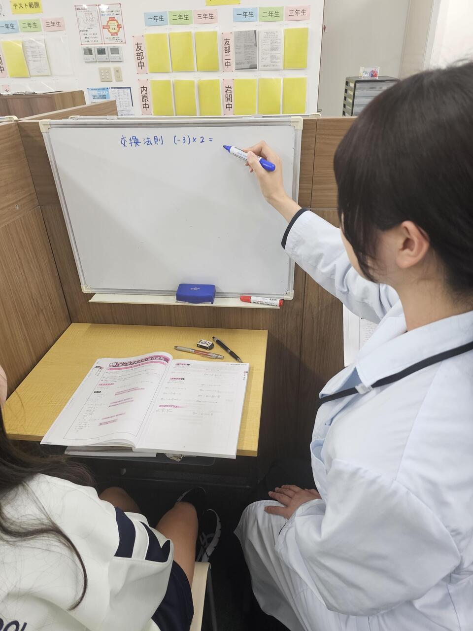 ナビ個別指導学院の授業は、個別の席ごとに設置された自分専用のホワイトボードで解き方や考え方を一緒に確認、それから生徒が問題を解くという「個別授業」スタイルです。