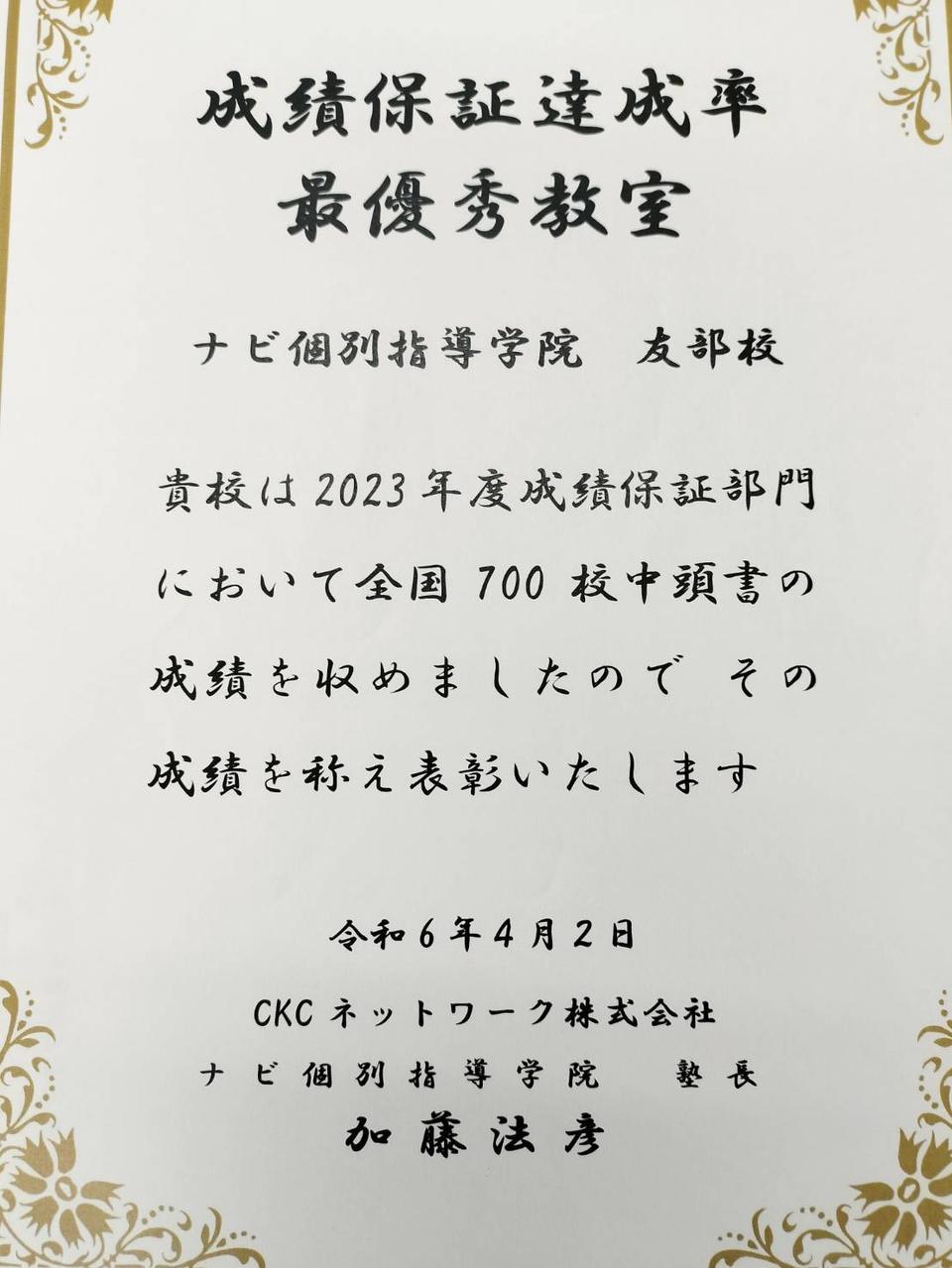 ナビ個別指導学院 友部校は、2023年度成績保証達成率 優秀教室に選ばれました!