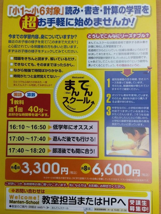 まんてんスクールは、小学生を対象に「読み・書き・計算」を練習できる超低価格で人気のコースです。月3,600円~(週1回、1教科)。