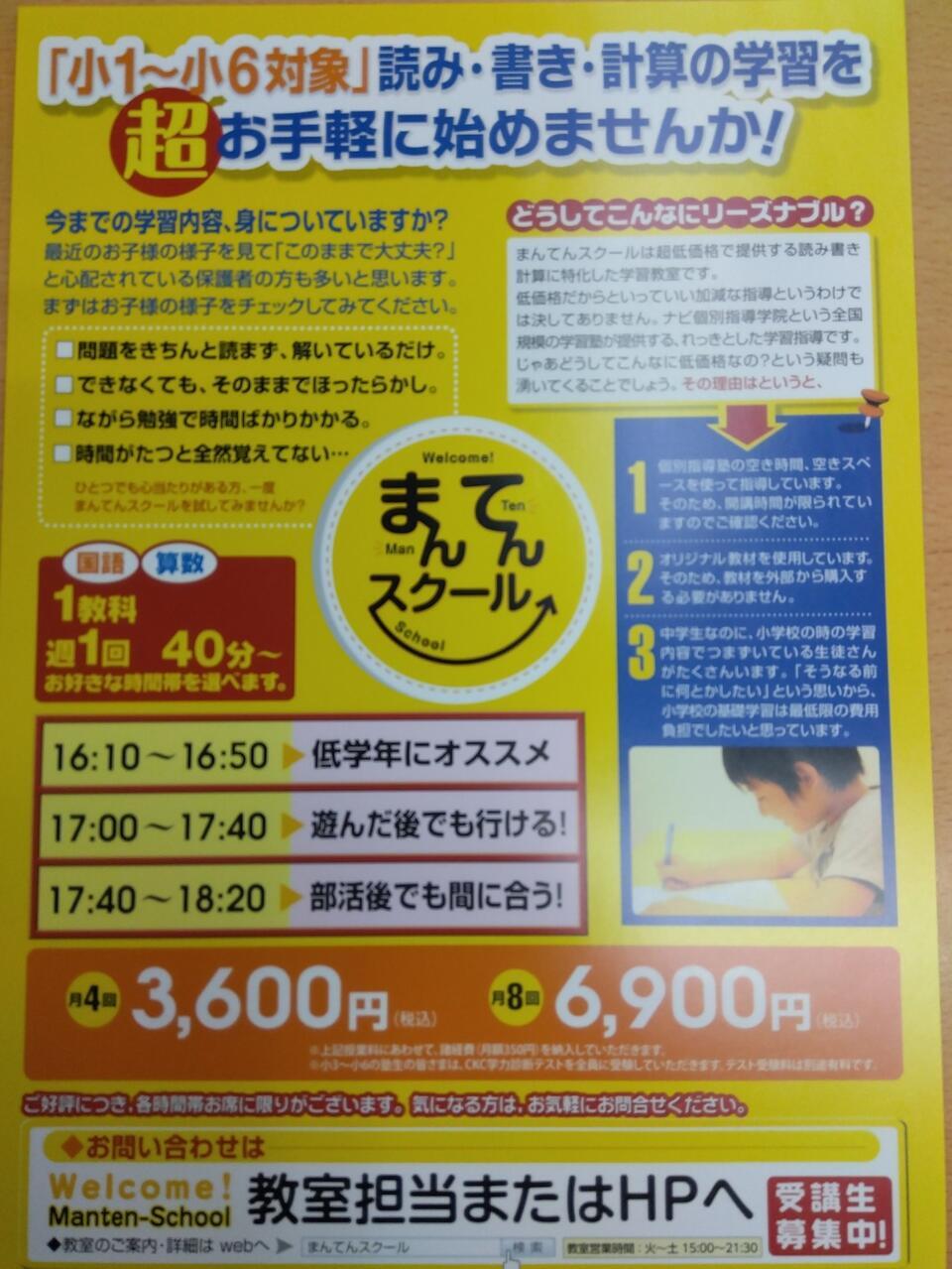 ナビ個別指導学院 取手校では、プリント学習の「まんてんスクール」の生徒さんを募集中です。