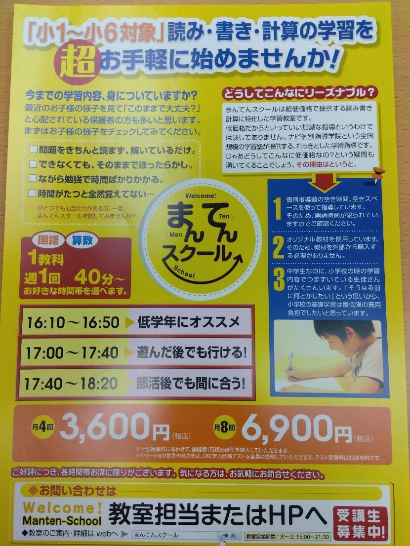 ナビ個別指導学院 取手校では、プリント学習の「まんてんスクール」の生徒さんを募集中です。