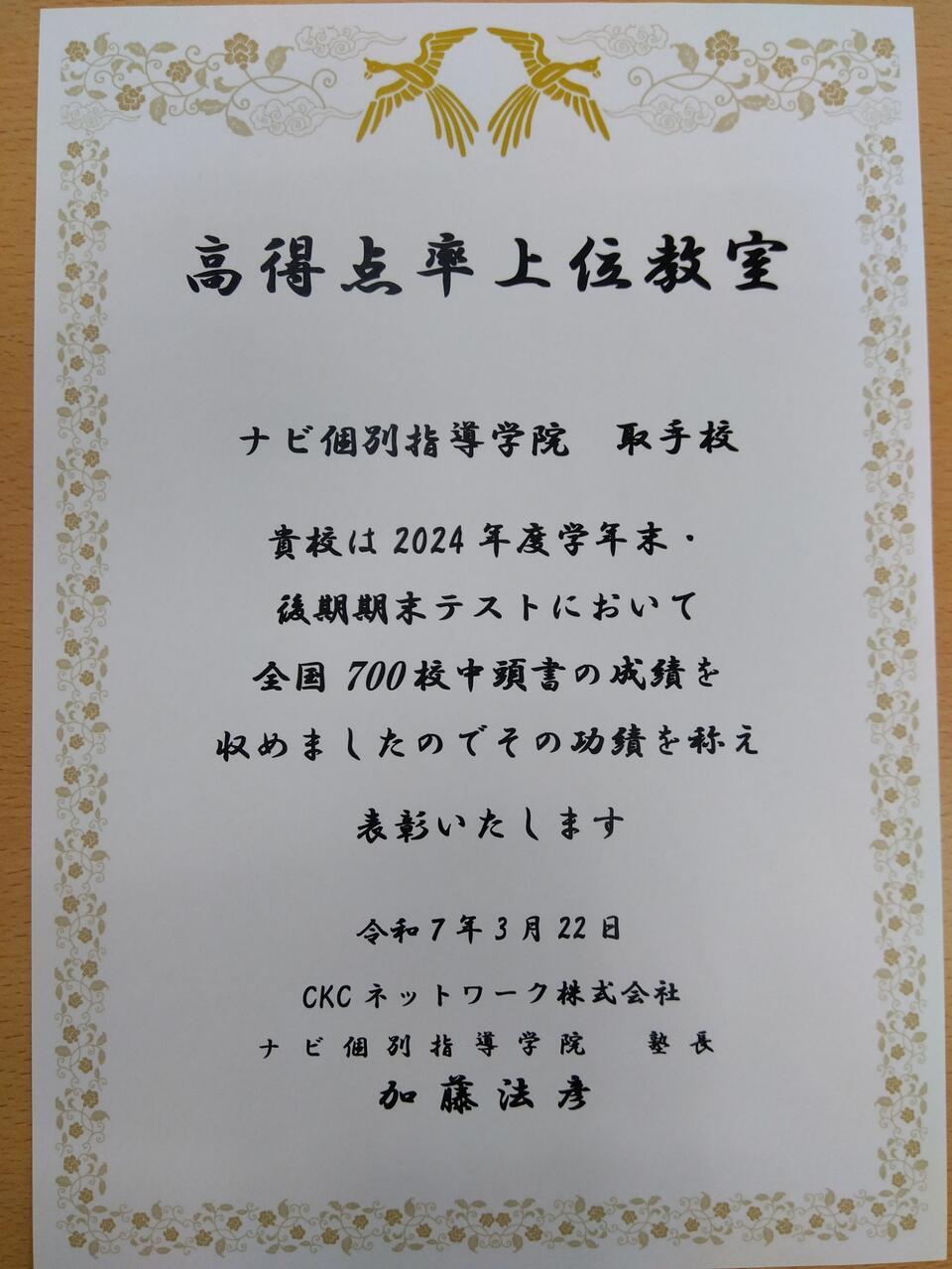 ナビ取手校は、高得点率上位教室として表彰されました!!