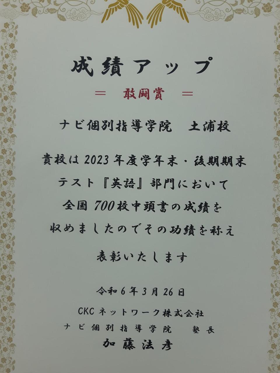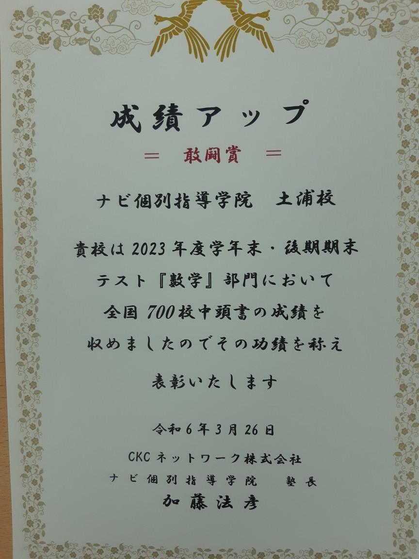全国720教室中【数学部門】【英語部門】において【敢闘賞】に