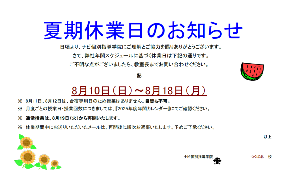 ナビ個別指導学院つくば北校です。