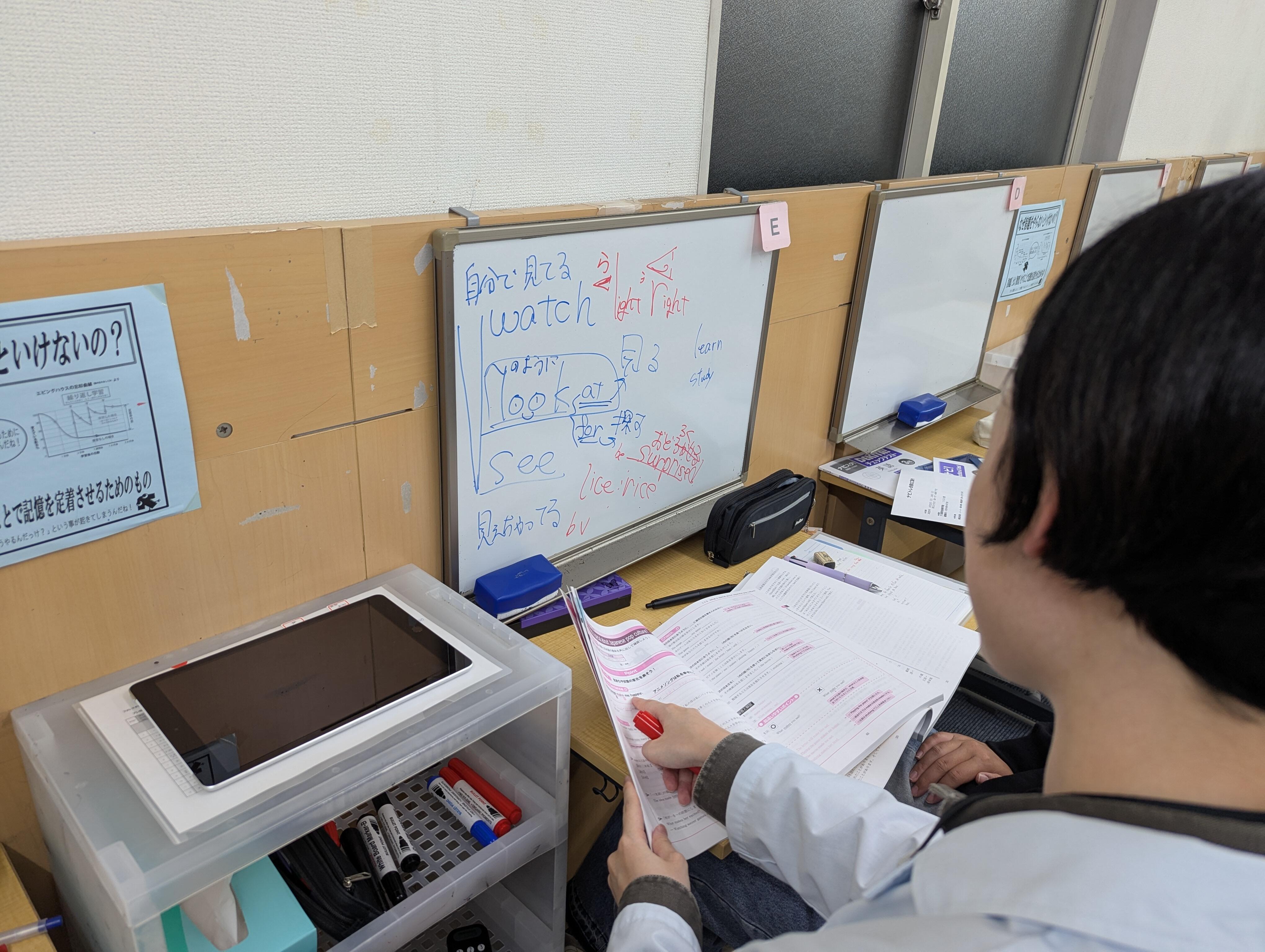 ナビ個別指導学院の授業は、個別の席ごとに設置された自分専用のホワイトボードで解き方や考え方を一緒に確認、それから生徒が問題を解くという「個別授業」スタイルです。
