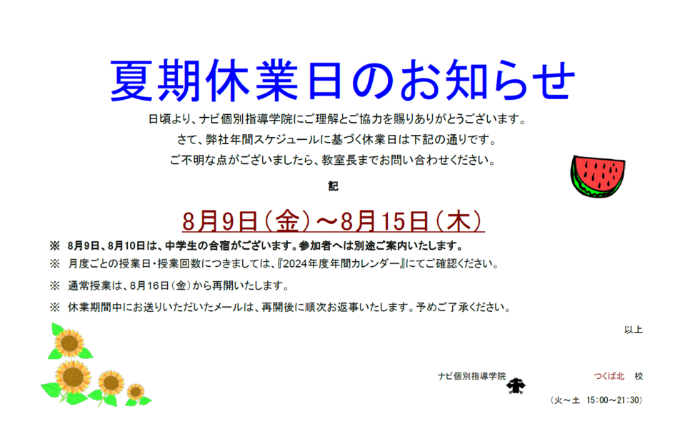 日頃より、ナビ個別指導学院にご理解とご協力を賜り、ありがとうございます。