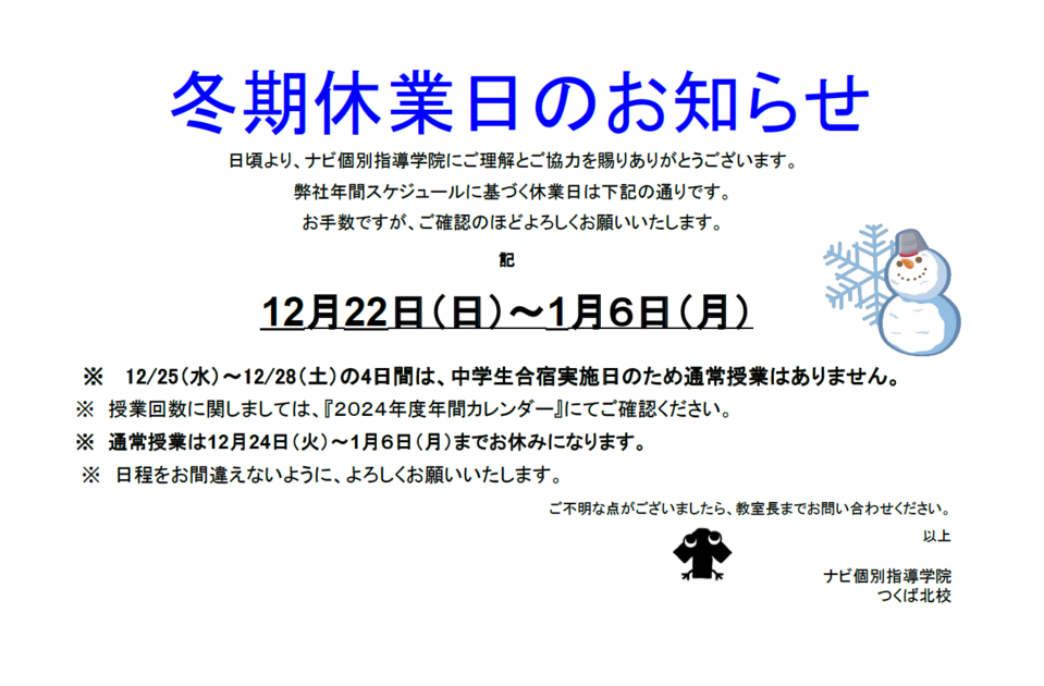 ※12月25日(水)から12月28日(土)は講習会専用日となります。通常授業はございませんのでご注意ください。