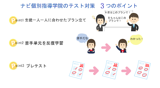 ナビ個別では、予習授業で先取り⇒学校の授業が復習に⇒テスト約1か月前にはテスト範囲の復習⇒テスト1週間前に最終チェック