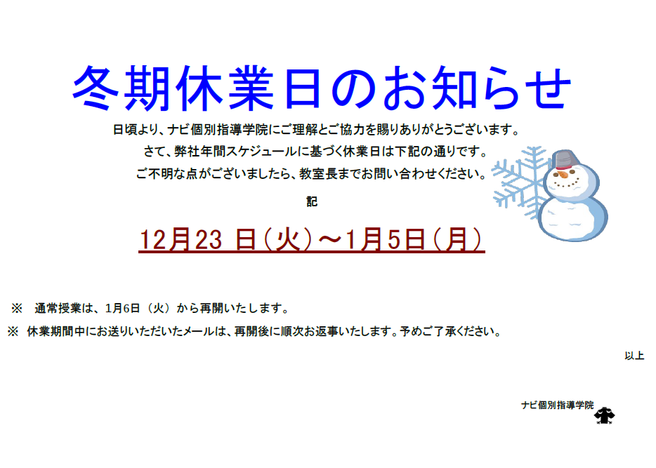 ※12月23日(火)から12月27日(土)は講習会専用日となります。通常授業はございませんのでご注意ください。