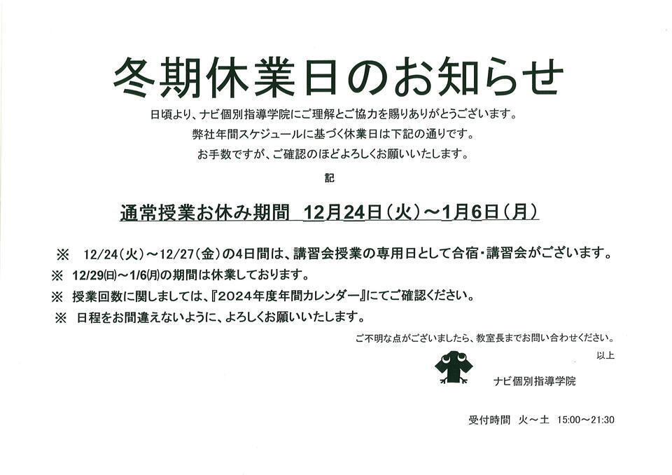 ※通常授業は1月7日(火)から再開いたします。