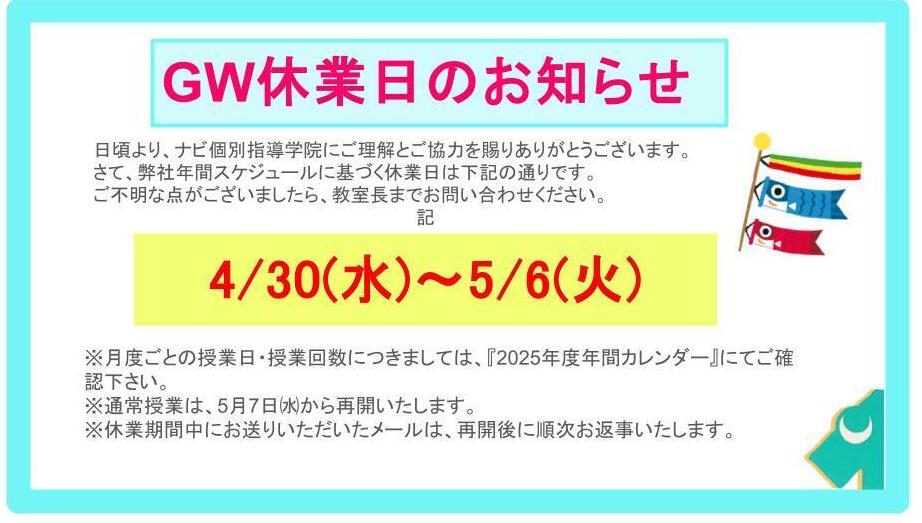 日頃より、ナビ個別指導学院にご理解とご協力を賜りありがとうございます。