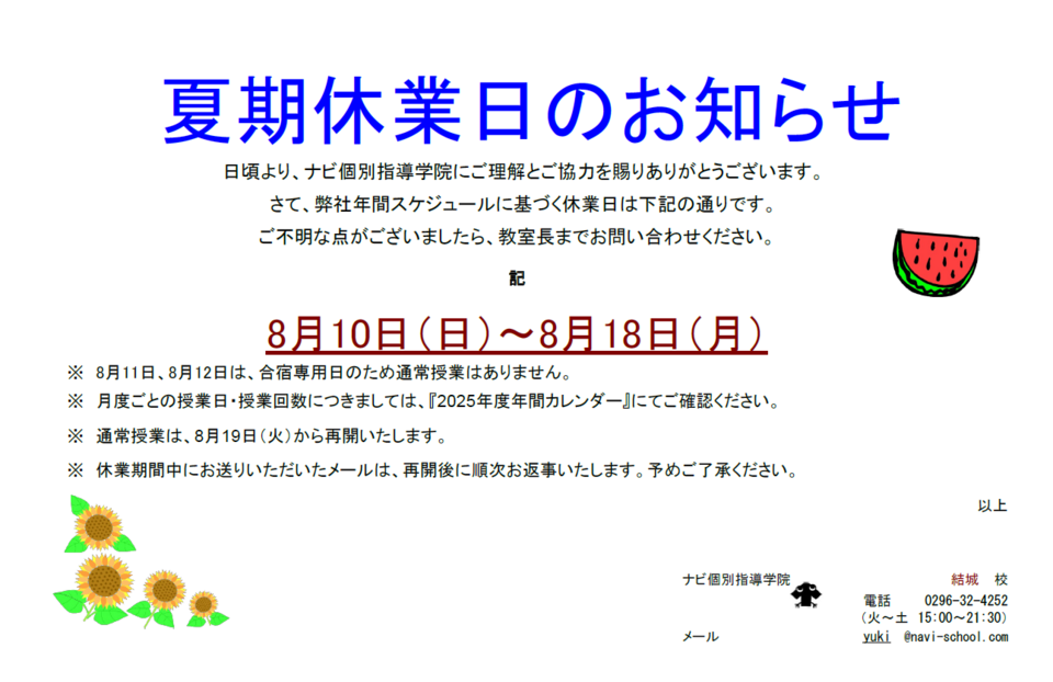 夏期休業日 8月10日(日)~8月18日(月)