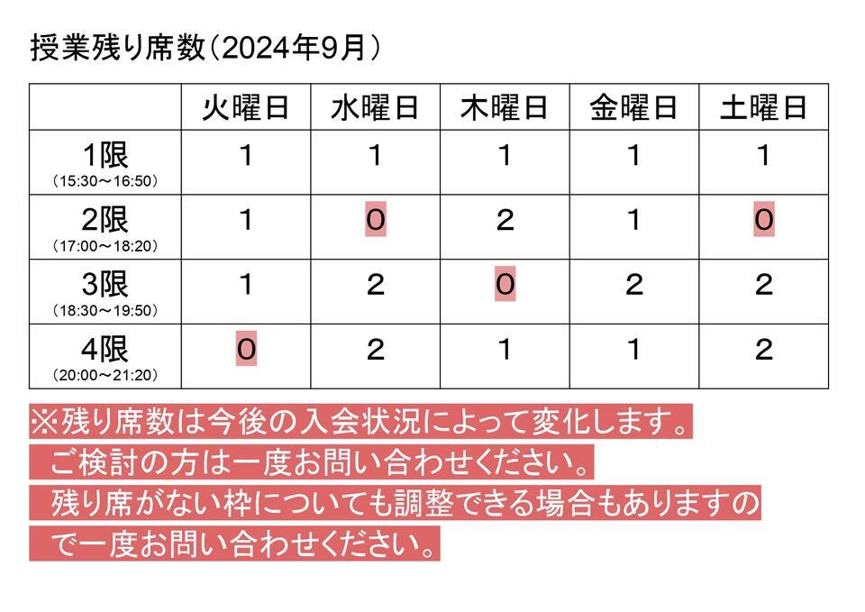 当塾の9月の受講可能な残りの座席数をお知らせします。