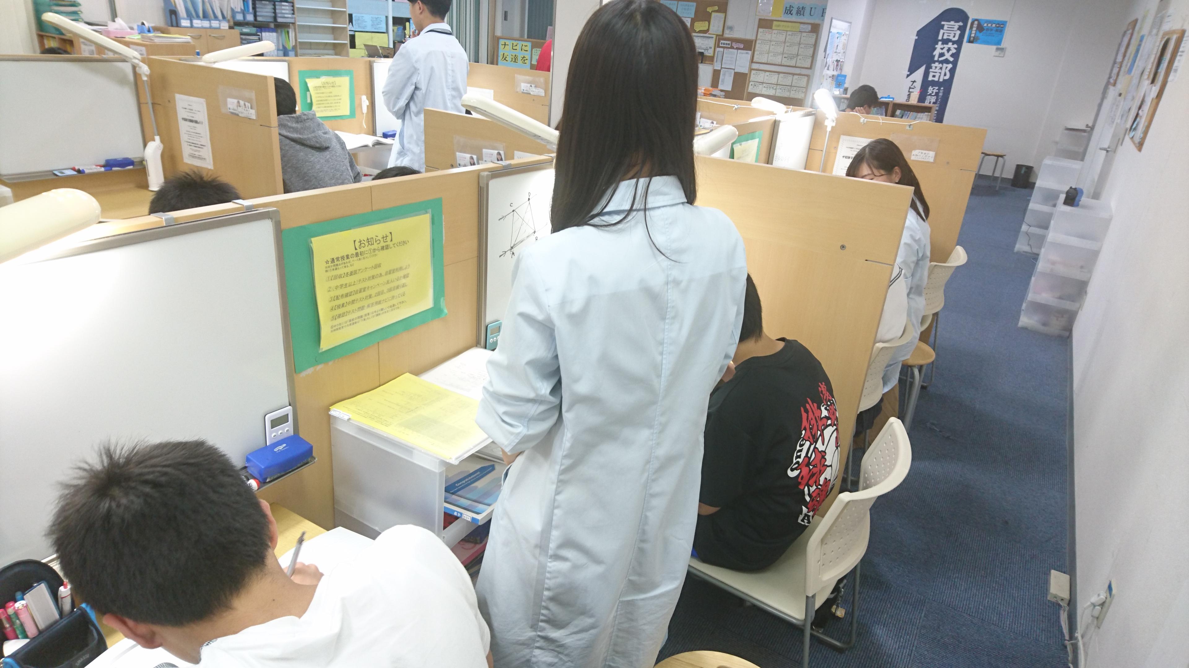 ナビ個別指導学院の授業は、個別の席ごとに設置された自分専用のホワイトボードで解き方や考え方を一緒に確認、それから生徒が問題を解くという「個別授業」スタイルです。