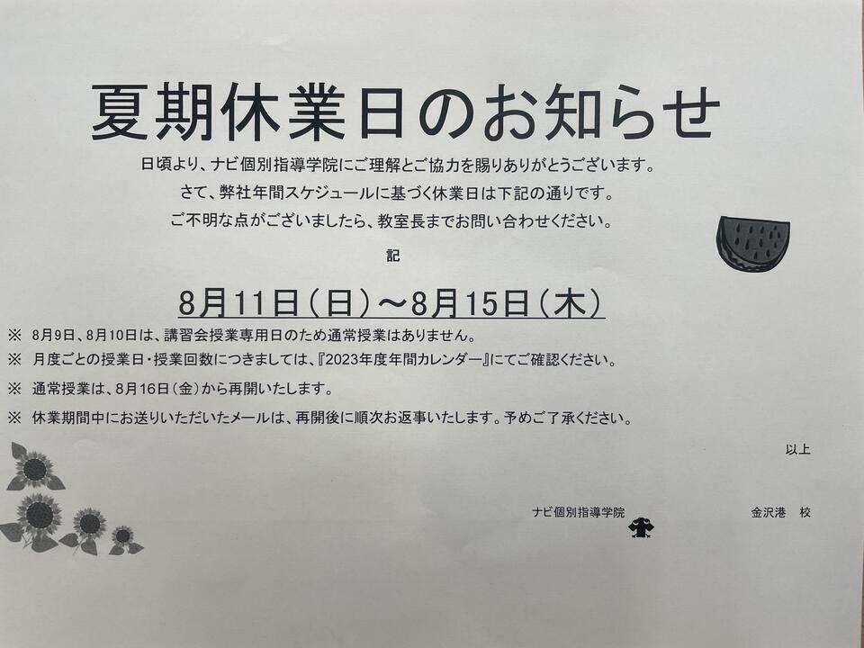 日頃より、ナビ個別指導学院にご理解とご協力を賜りありがとうございます。さて、弊社年間スケジュールに基づく休業日は下記の通りです。