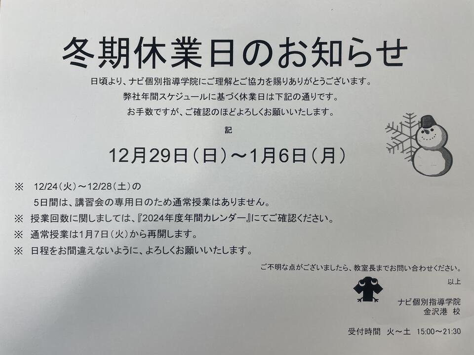 当塾では、12月29日(日)~1月6日(月)まで、冬期休業をいただきます。通常授業は行っておりません。1月7日(火)より通常授業を再開いたします。今後ともよろしくお願いいたします。