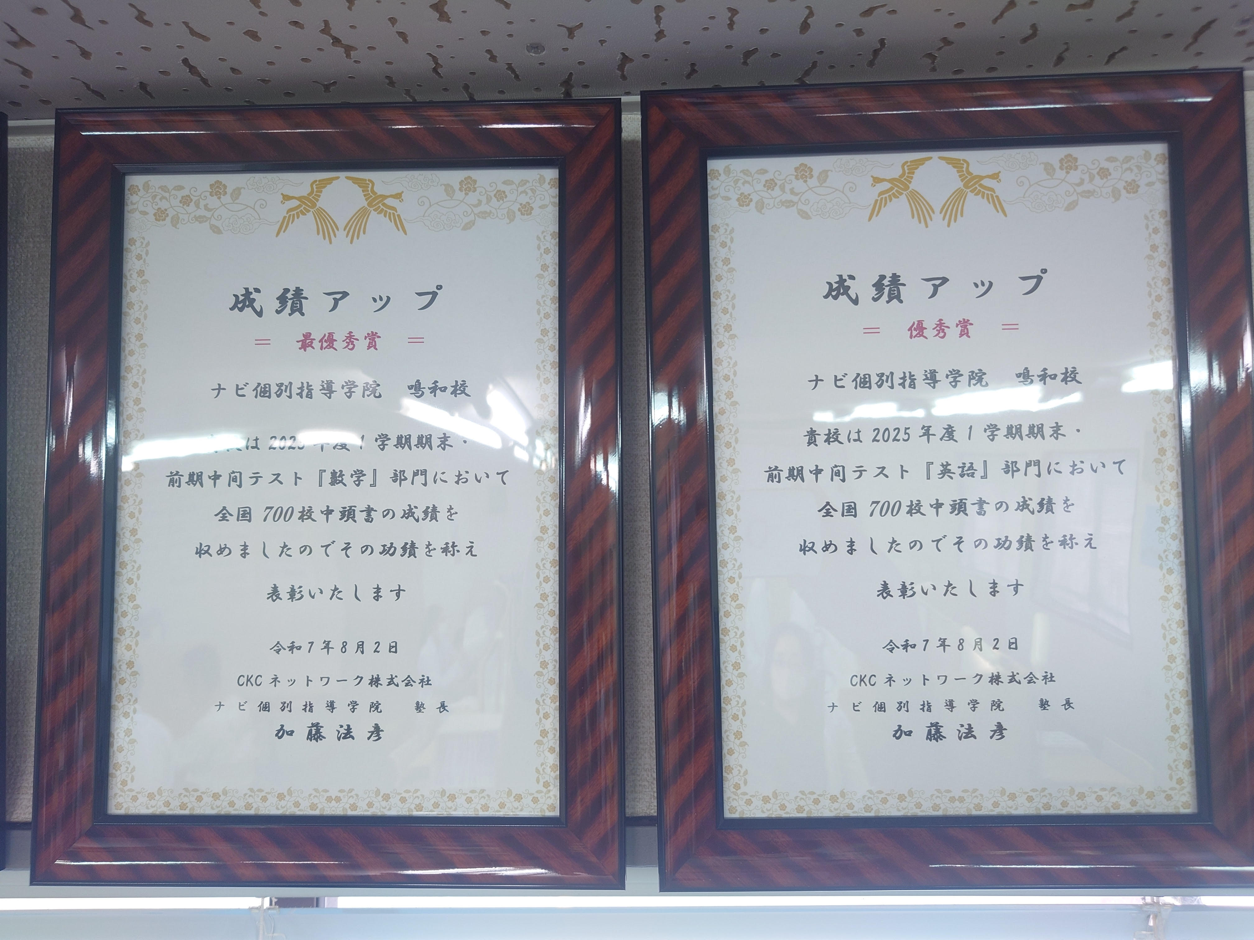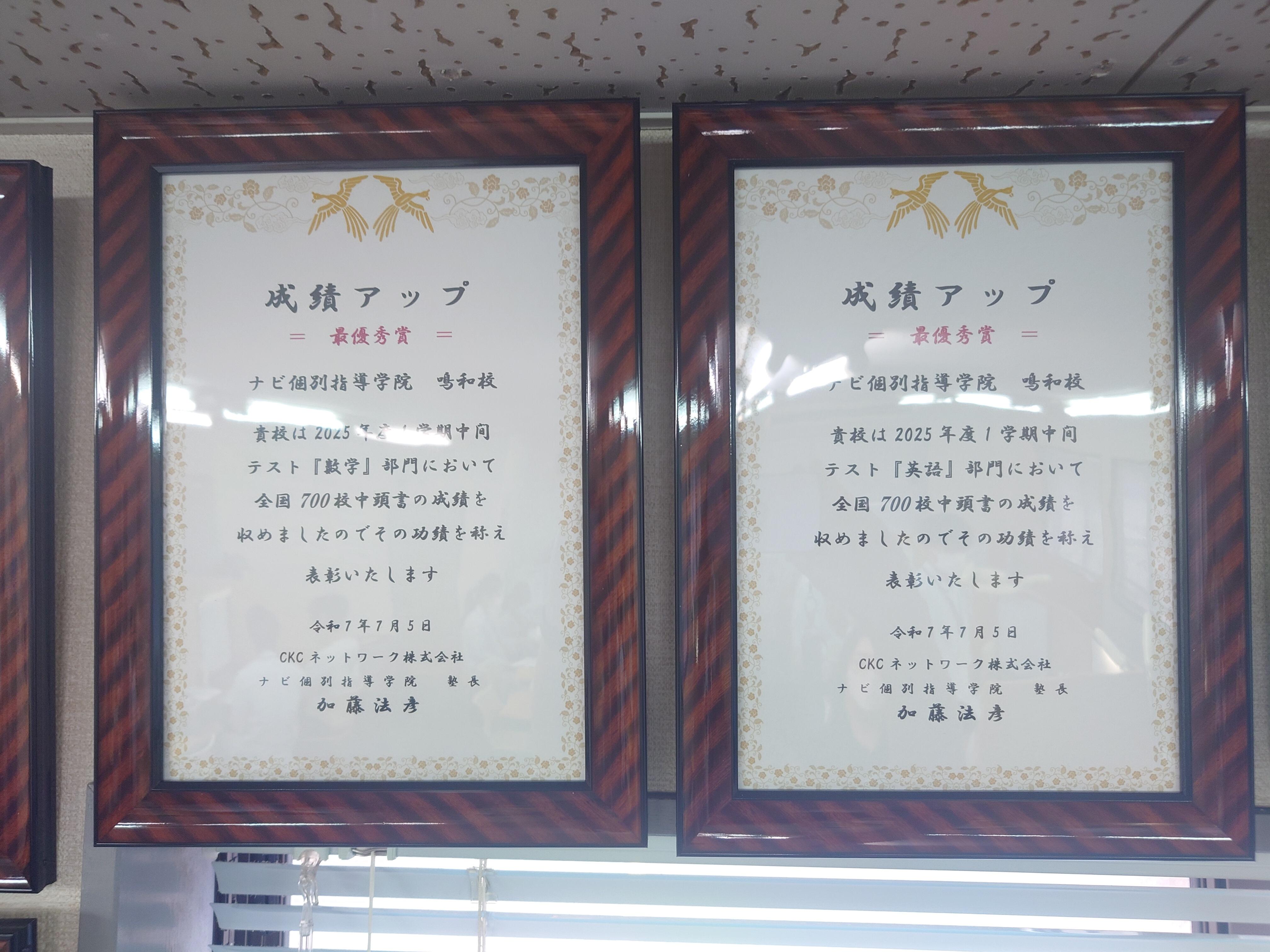 1学期期末テストは数学は最優秀賞、英語は優秀賞でした!!