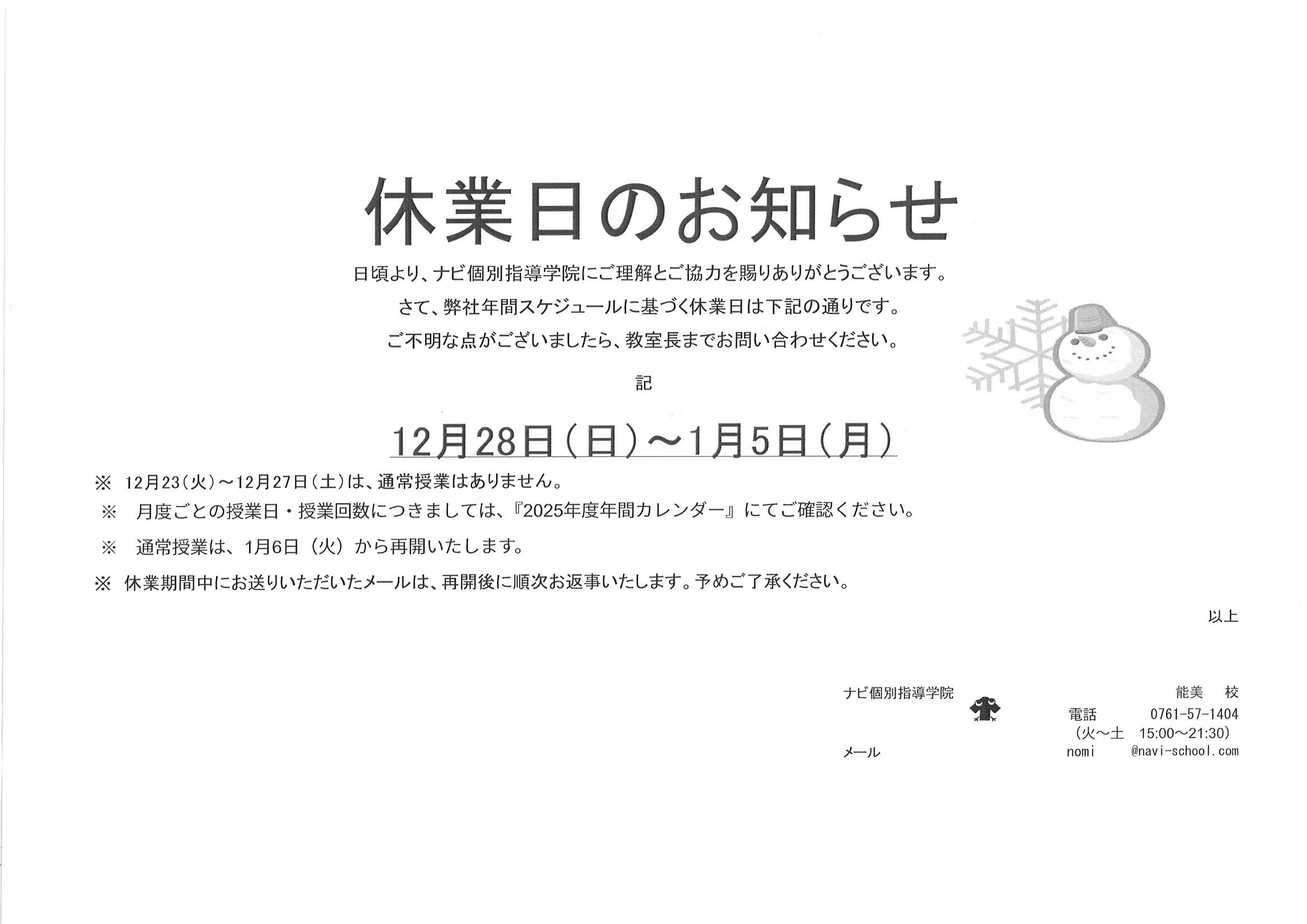 通常授業は1/6(火)より再開いたします。