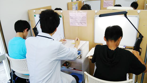 ナビ個別指導学院の授業は、個別の席ごとに設置された自分専用のホワイトボードで解き方や考え方を一緒に確認、それから生徒が問題を解くという「個別授業」スタイルです。
