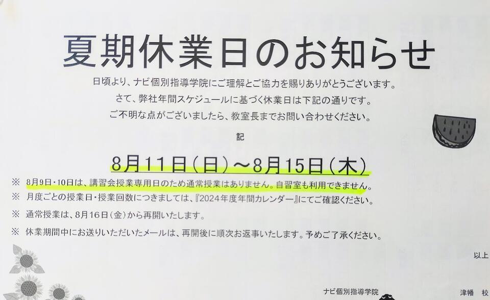 なお8月9日と10日は中3合宿専用日となりますので授業はありません。