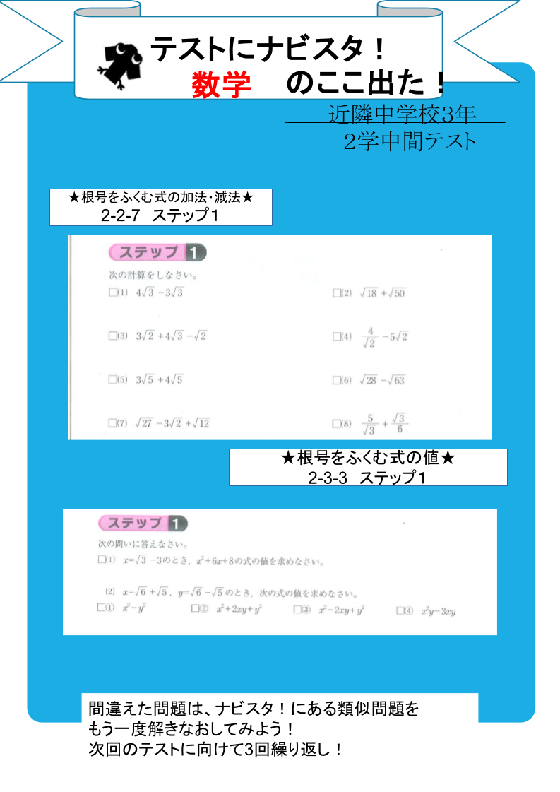 そこで、ナビ個別の自社教材「ナビスタ!」と近隣中学校の前回定期テストの