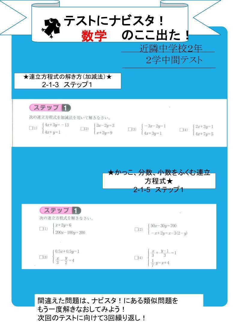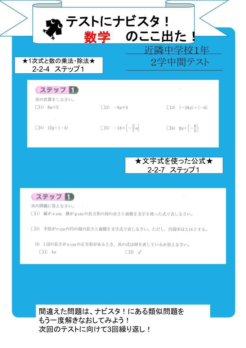 前回は中3の数学のテスト内容を、ナビ個別の自社教材「ナビスタ!」と近隣中学校の前回定期テストの分析を「ここ出た!」で確認しました!