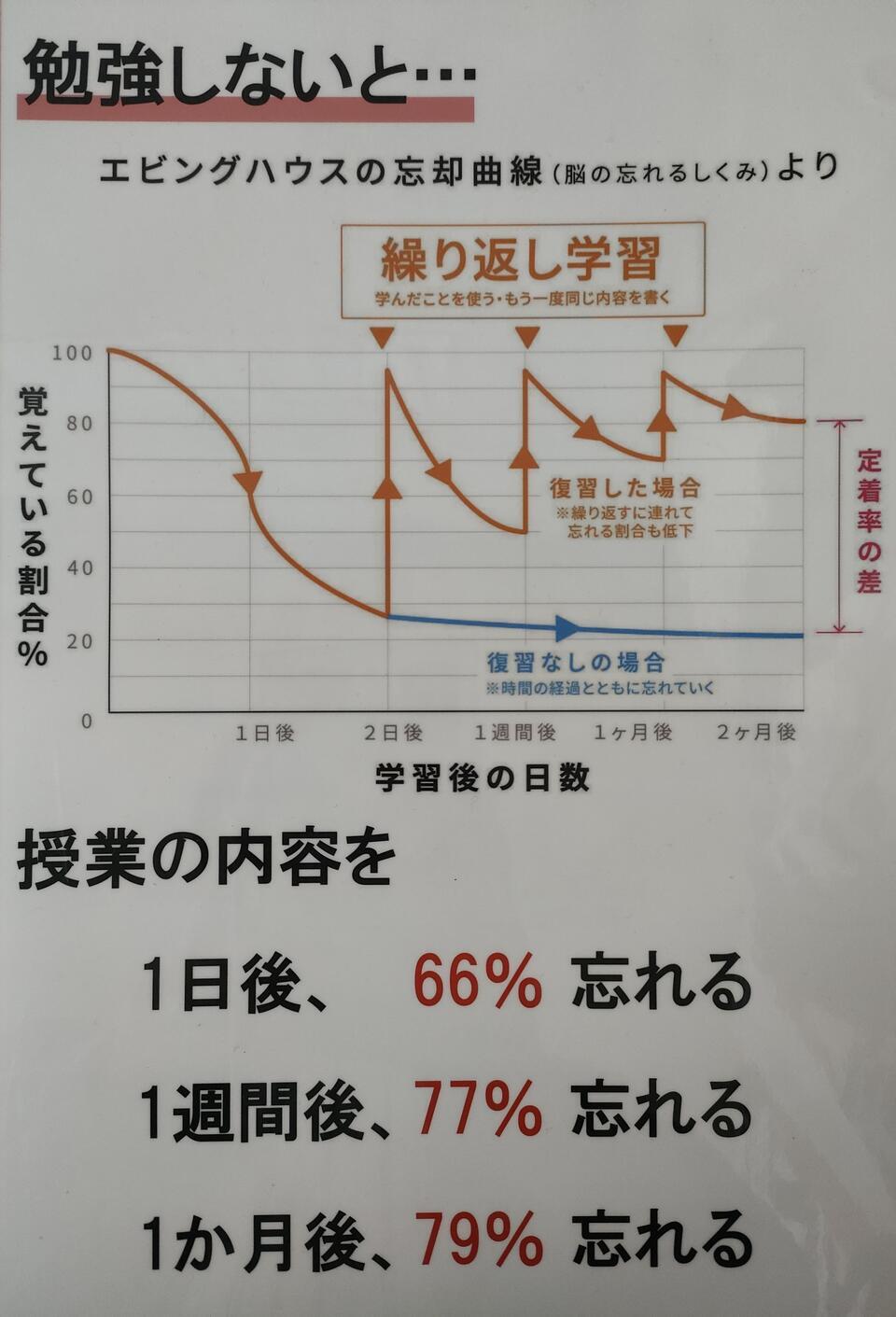 1日後には66%忘れ、1週間後には77%忘れるそうです。