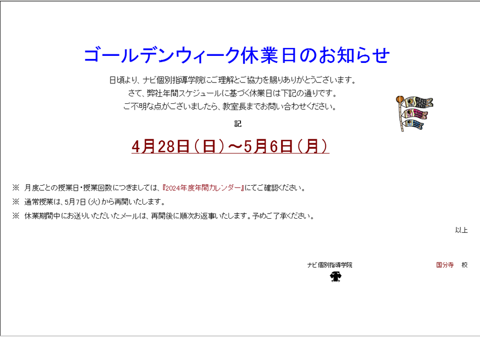 国分寺町近隣の皆様、こんにちは、個別指導塾『ナビ個別指導学院国分寺校』です!
