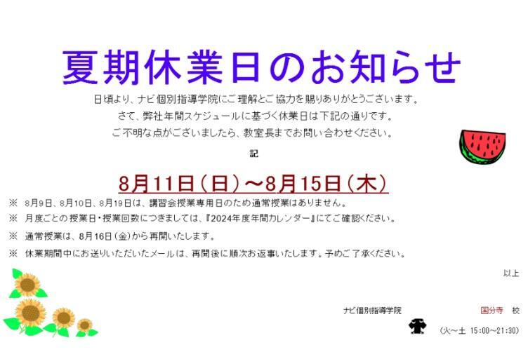 前回のブログでもお伝えしましたが、ナビ個別指導学院国分寺校は明日8/11(日)から8/15(木)までお休みをいただきます。