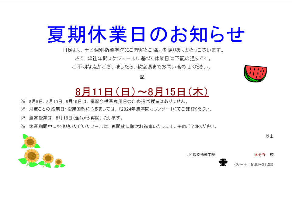 夏期休業日 8月11日(日)~8月15日(木)