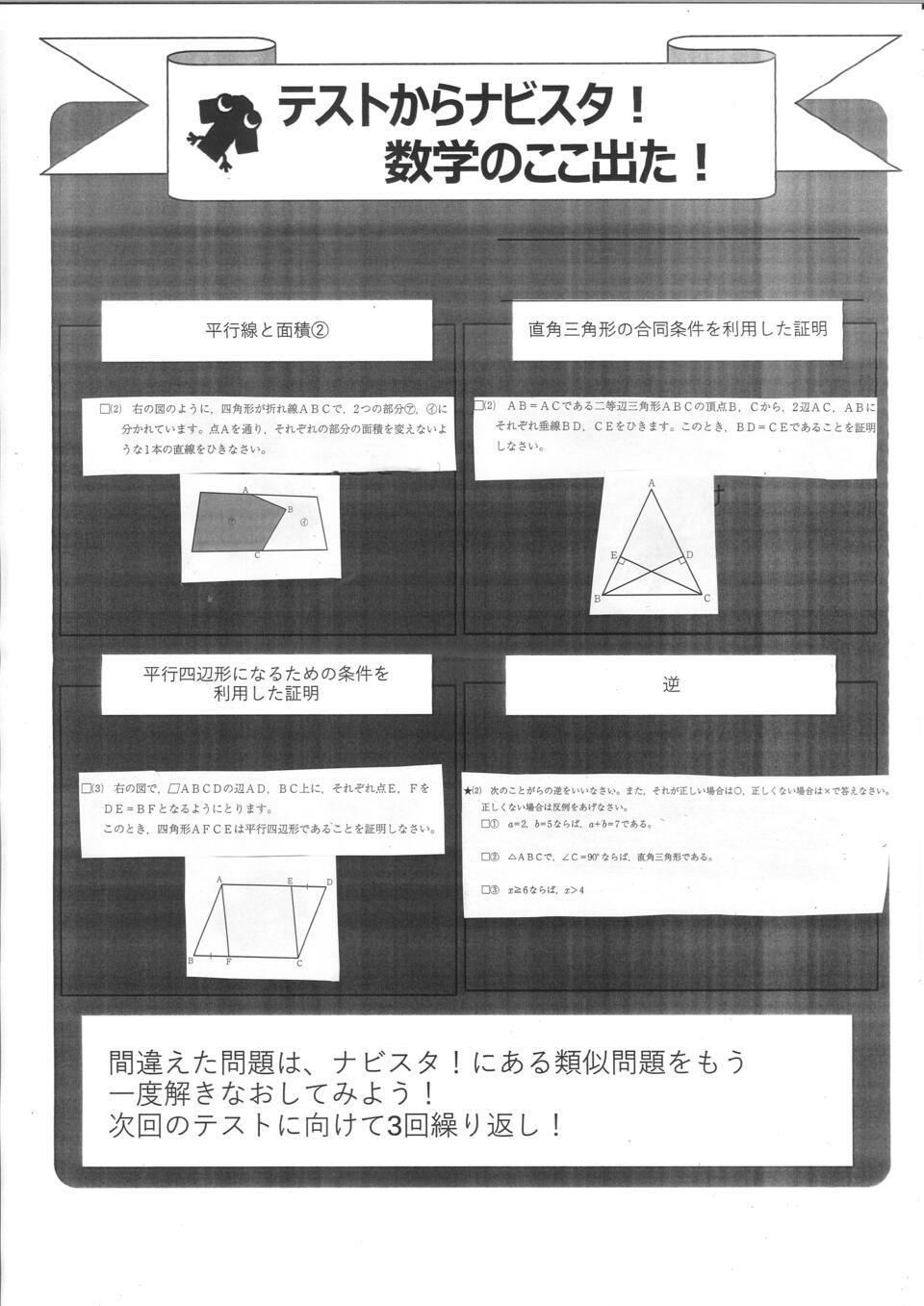 今回はナビ個別の自社教材「ナビスタ!」と近隣中学校2年生の学年末テストの分析を「ここ出た!」で確認してみましょう。