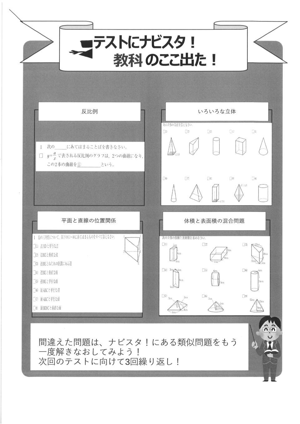 平面図形・空間図形の単元では、位置関係で「ねじれの位置」・「平行」・「垂直」な辺や面を答えられるように復習しておきましょう。表面積や体積を求めるときは公式の暗記はもちろんです
