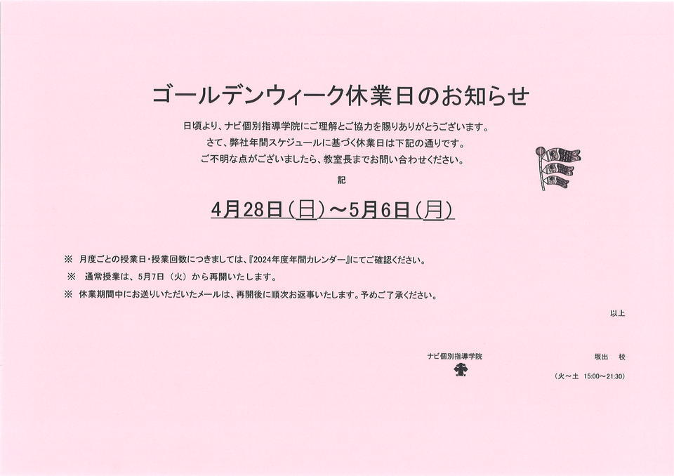 ナビ個別指導学院坂出校では以下の期間ゴールデンウィーク休業になっております。