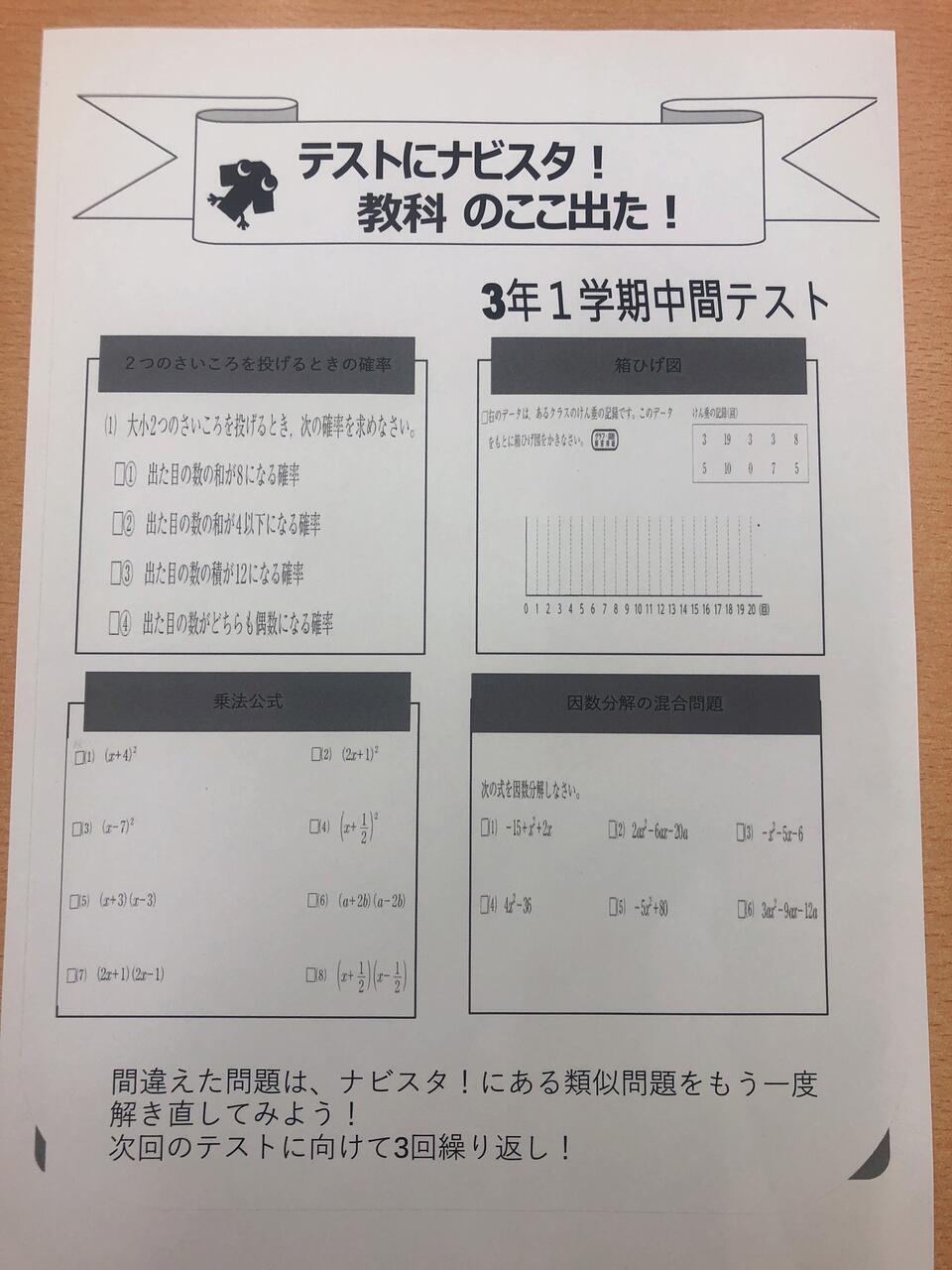 今回のテスト範囲の単元は「確率」・「箱ひげ図」・「乗法公式を用いた計算」でした。