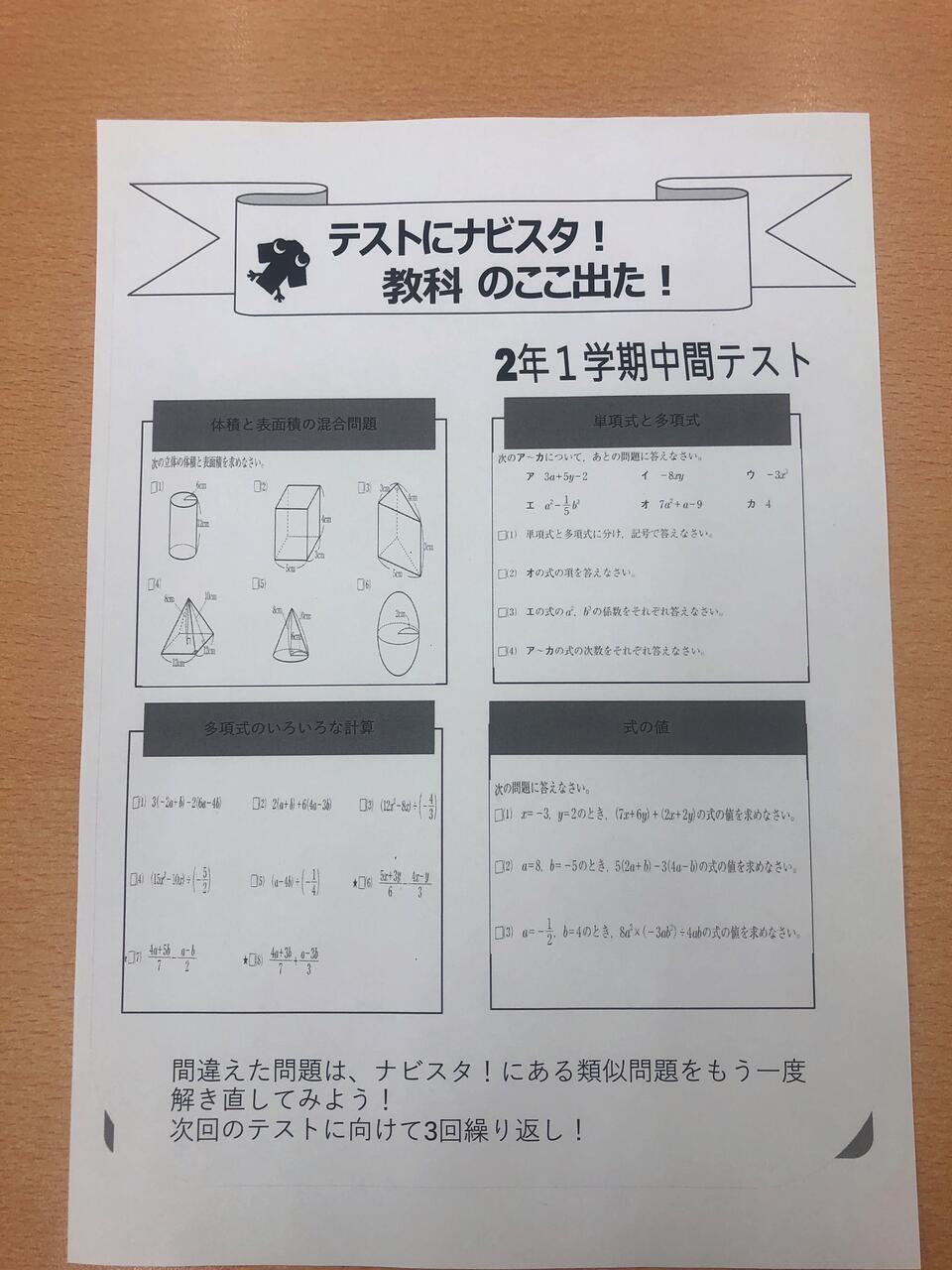 前回のテストでは、立体の体積と表面積、データの分析、単項式・多項式の計算が範囲でした。