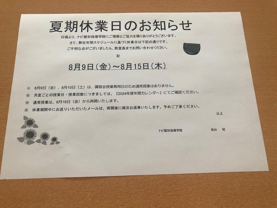 タイトルにもある通り、ナビ個別指導学院坂出校では以下の期間が夏期休業日となります。